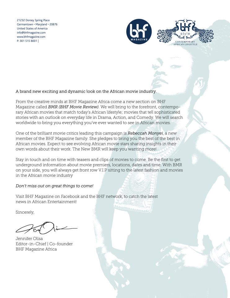 Something Extraordinary is happening at BHF Magazine Africa! With today's volatile market, we found the solution to the African film industry! "Say Hello" to the New BMR (BHF MOVIE REVIEW) on BHF Magazine Africa! Rebeccah Monyei will lead this department on BHF Network. Expect to see reviews from the Hottest and well put together African films! Visit BHF on Facebook and Rebeccah Monyei's Fan Page to enjoy the latest News on African Entertainment!