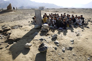 Afghan boys sit on the ground outdoors for their lesson, near Khas Kunar refugee camp, Kunar Province, eastern Afghanistan.